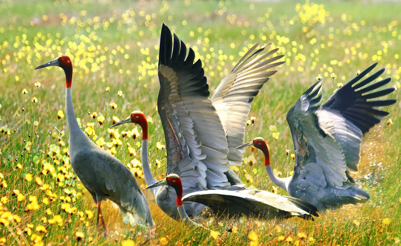 Board a traditional sampan boat and slowly cruise through the waterways accompanied by your birds expert in the early morning to see a number threatened large water birds such as Sarus Crane, Lesser Adjutant, Woolly-necked and Painted Storks. Other birds are common and easy to see, including the Purple Swamphen, Broze-winged and Pheasant-tailed Jacanas, Yellow and Cinnamon Bitterns, Spot-billed Duck… Stop at observation towers for panoramic views over the wetlands and bird colonies.