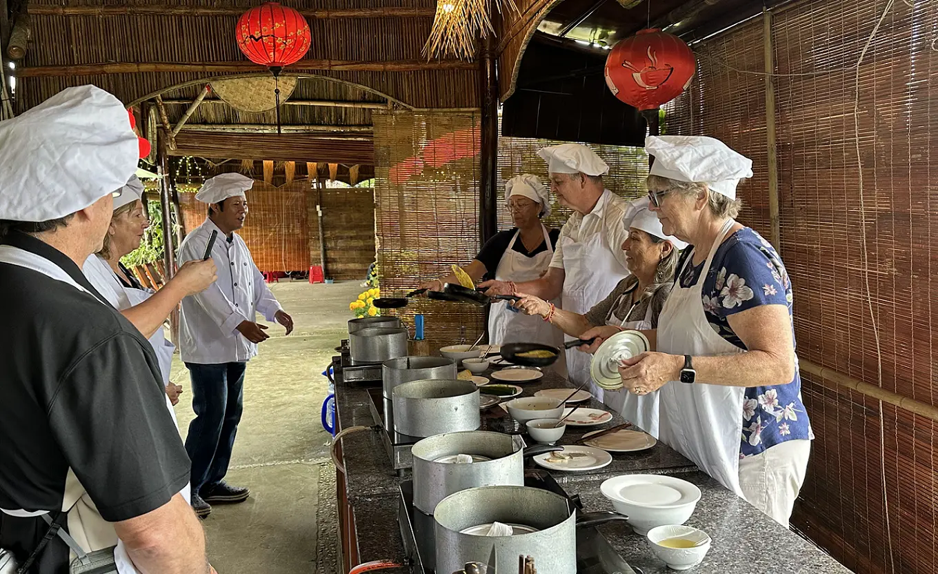 After a short walk to the cooking class, join in a brief discussion about the art of Hoi An's gastronomy, including its vegetables, herbs, and spices. The chef will reveal their secrets for making each dish truly delicious. Prepare and cook dish by dish then enjoy a delightful meal at the end of the lesson.